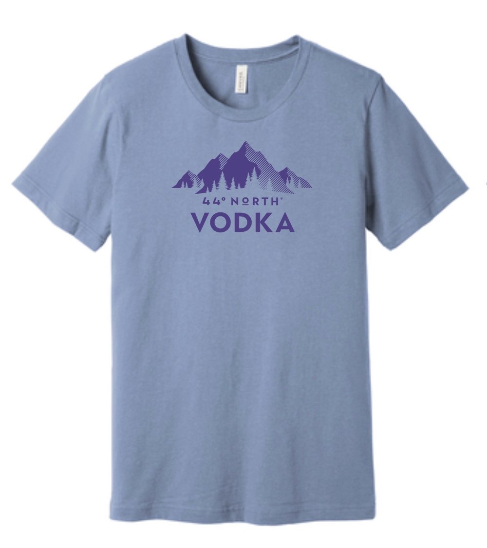 44º North® Vodka Mountain Heather Blue Tee Unisex Fitted Bella Canvas 52% Cotton 48% Poly blend T-shirt with 44º North Vodka Mountains + Shield Logo in Purple on back